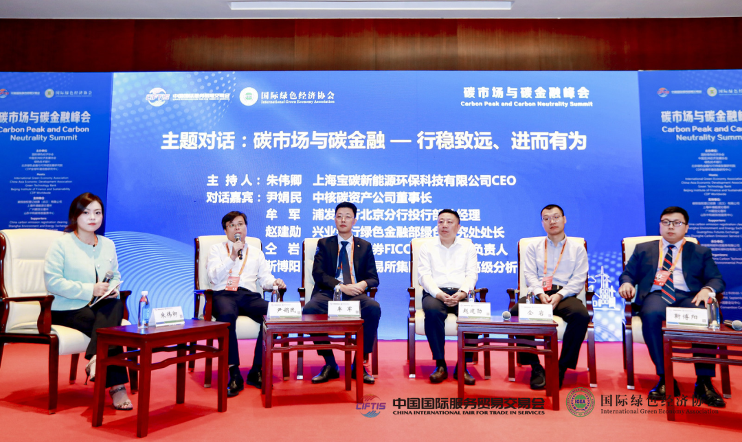 峰会同步举办了“碳市场与碳金融——行稳致远、进而有为”主题对话。上海宝碳新能源环保科技有限公司CEO朱伟卿、中核碳资产公司董事长尹娟民、浦发银行北京分行投行部总经理牟军、兴业银行绿色金融部(战略客户部)绿色研究处处长赵建勋、国泰君安证券FICC碳金融业务负责人仝岩、伦敦证券交易所集团能源转型高级分析师靳博阳等嘉宾,基于碳市场与碳金融发展,焦点碰撞,研讨金融、市场循序渐进的发展方向。